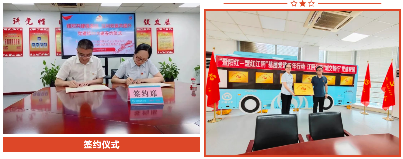 江阴市公共交通有限公司党总支书记、董事长兼总经理杨科与江阴市口腔病防治所党支部书记、江阴口腔医院副院长彭佳美代表双方党(总)支部进行签约、揭幕。江阴城市发展集团有限公司党委委员、副总经理徐沂江授牌。