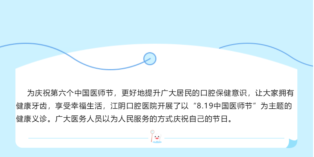 此次江阴口腔医院以义诊的形式庆祝第六个“中国医师节”,彰显了江阴口腔医院医务工作者心系百姓口腔健康的初心,进一步拉近了医院与广大群众的距离,帮助其增强口腔健康意识,培养良好的生活方式和生活习惯,让更多百姓能够享受到优质的诊疗服务和健康指导,用实际行动为百姓的口腔健康保驾护航。