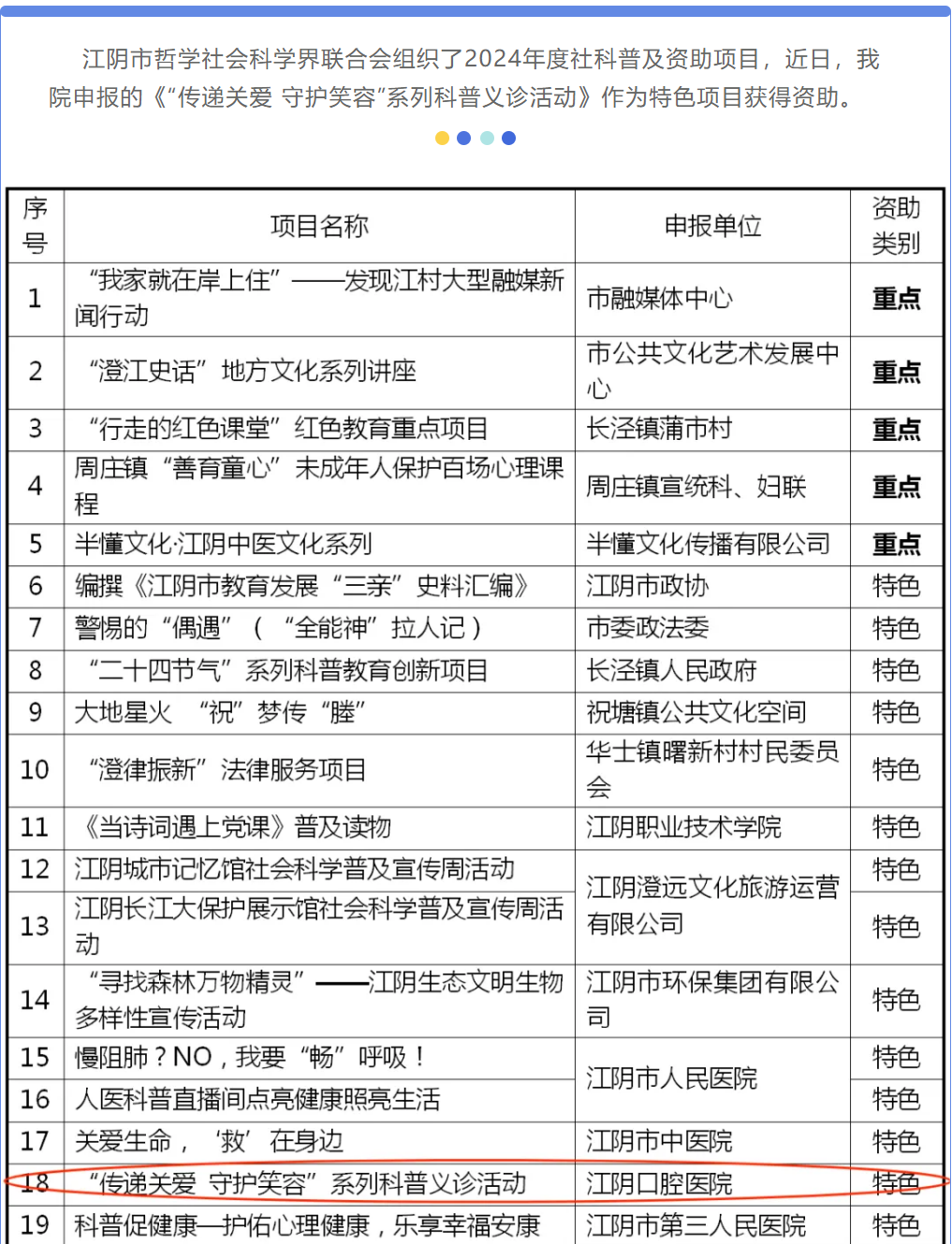 【喜报】江阴口腔医院喜获江阴市社科普及项目资助