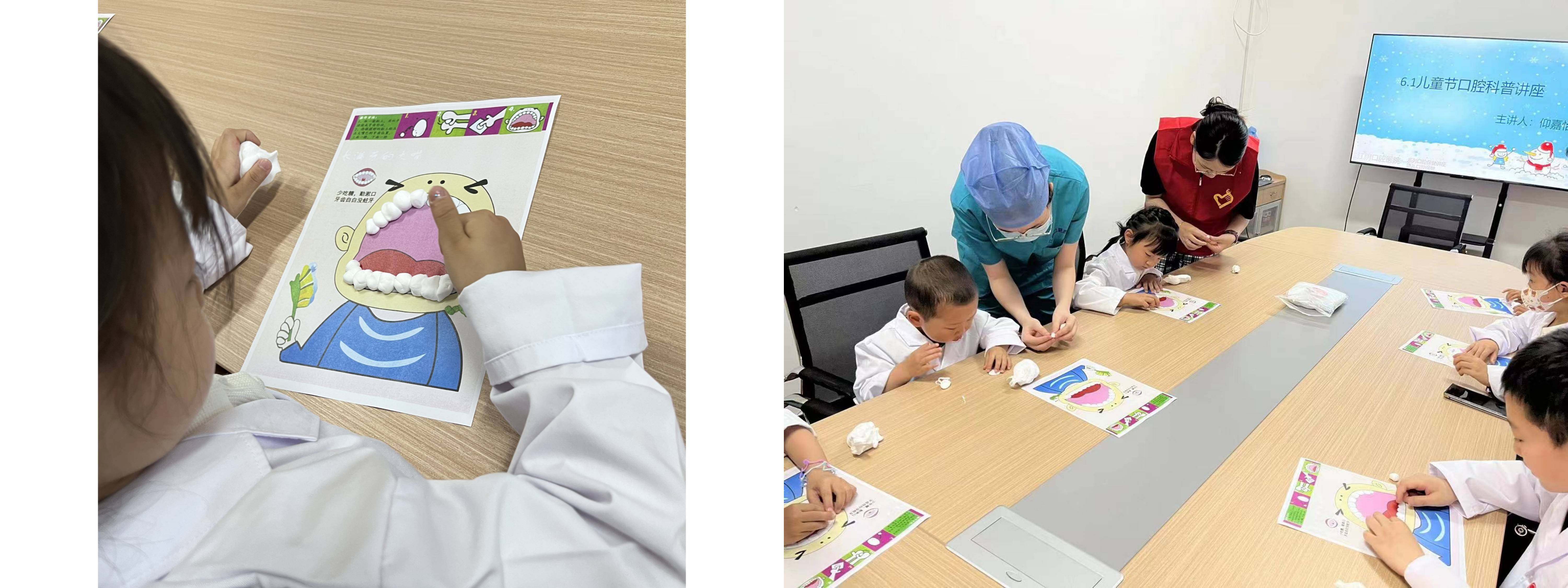 活动第一站是一堂生动有趣的口腔健康教育科普讲座。牙齿对我们来说意味着什么?牙齿的构造是怎么样的?我们用哪些工具来修补坏了的牙齿?在这堂口腔健康教育课上,我院仰嘉怡医生用生动的图片和视频动画让深刻的口腔健康知识在孩子们小小的心田里“生根发芽”。