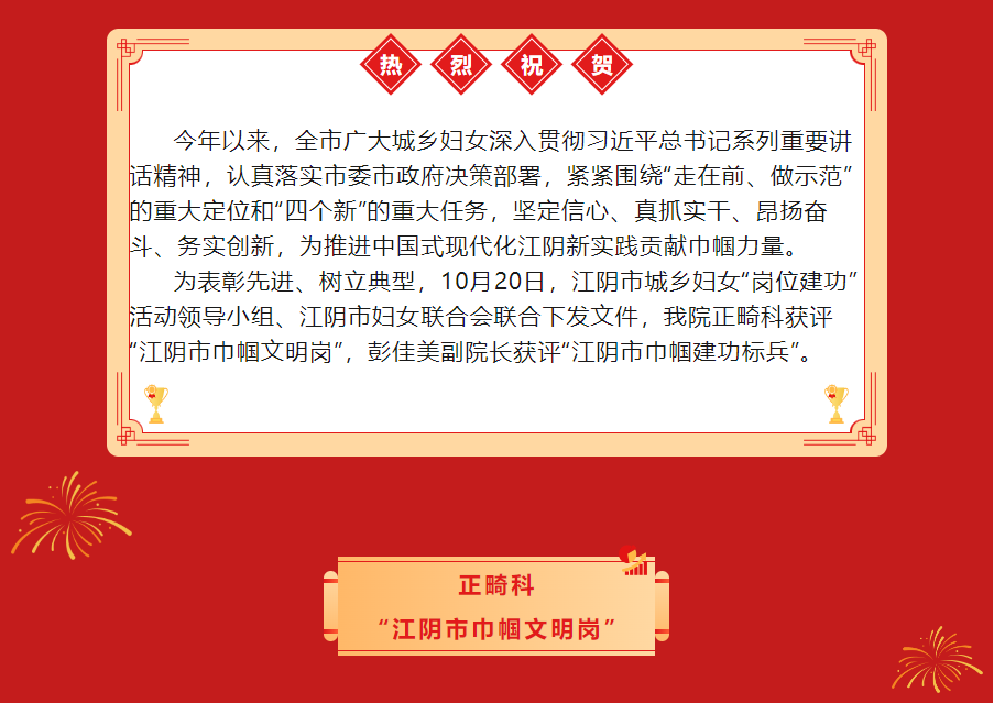 【喜报】凝聚“她”力量,巾帼显担当——我院获评江阴市2023年度“巾帼文明岗”及“巾帼建功标兵”